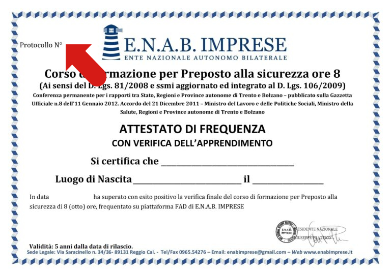 COME SI ESEGUE LA VERIFICA? Tutti gli attestati emessi sono archiviati in un database dedicato, che ne consente la verifica della validità. Dove posso trovare il numero di protocollo dell’attestato? Il numero di protocollo è generalmente situato nella parte superiore sinistra del documento. Si tratta di un codice alfanumerico univoco. VERIFICA